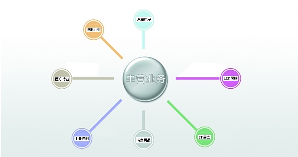 经过多年创新发展,公司主营产品形成以汽车电子、通讯电子和照明行业为三大业务涵盖领域。在汽车电子上的应用包括位置传感器、点火器模块,电压调整器模块、燃油泵油位传感器、汽车气门及离合器、曲轴传感器等;公司产品在通讯电子的应用主要包f4G/LTE、3G/GPRS网络应用、通信终端设备、基站应用、高频模块、CATV应用、程控电话等;公司产品在照明行业的应用主要包括LED照明、电子镇流器、照明电路、电源电路、照明驱动电路等。